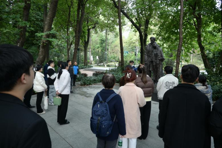(同志们瞻仰革命英烈雕像、了解光荣事迹)