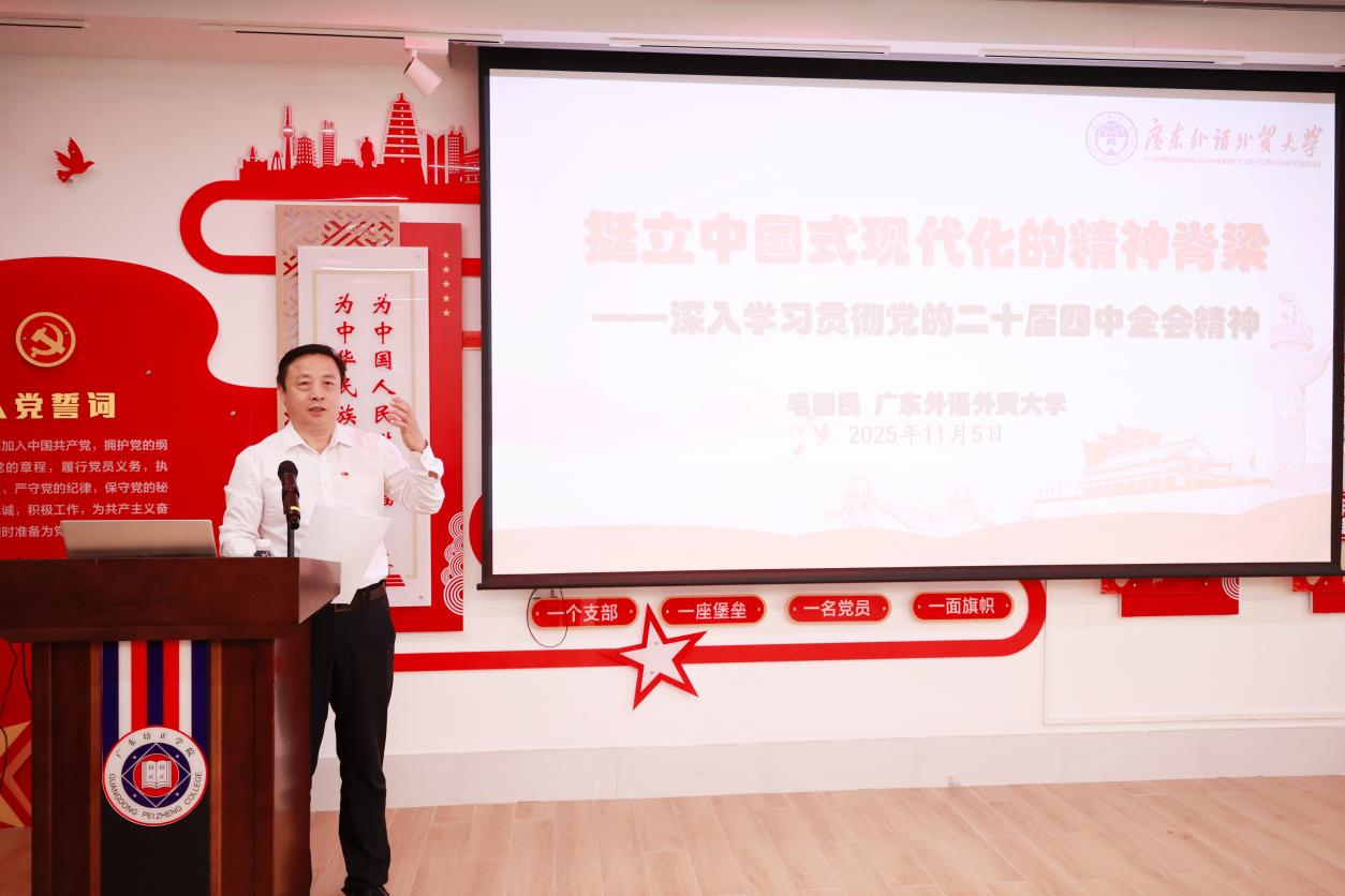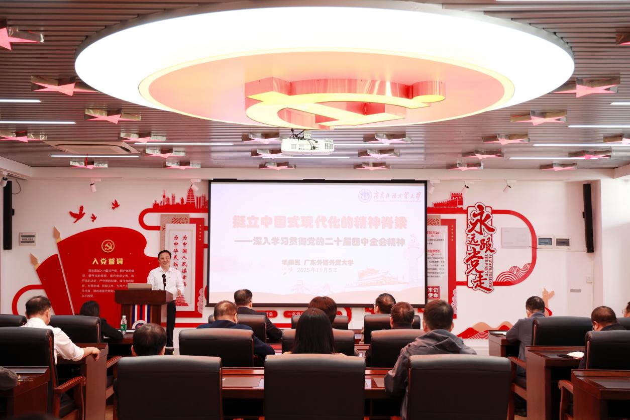 本网讯(党委办 郑菁华)11月5日上午,我校在党建文化中心召开党委理论学习中心组学习会暨中层以上干部党的二十届四中全会精神专题学习会。会议邀请中共广东外语外贸大学委员会委员、广东外语外贸大学马克思主义学院院长、广东省文化传播研究会副会长、广东省社会管理研究会副会长毛国民教授作《挺立中国式现代化的精神脊梁——深入学习贯彻党的二十届四中全会精神》主题辅导报告。学校党委理论学习中心组成员和全体中层干部参加学习会。校党委书记武电平主持会议并讲话。