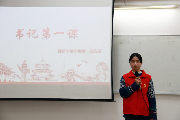 (本网讯)新学期伊始,3月9日下午,经济学院学生第一党支部书记胡曦老师在4501教室以“学四史,担使命”为主题,为我院学生第一党支部的同志们讲授新学期“书记第一课”,号召同志们从党史学习教育中汲取奋进的力量。