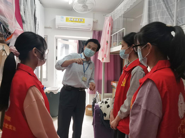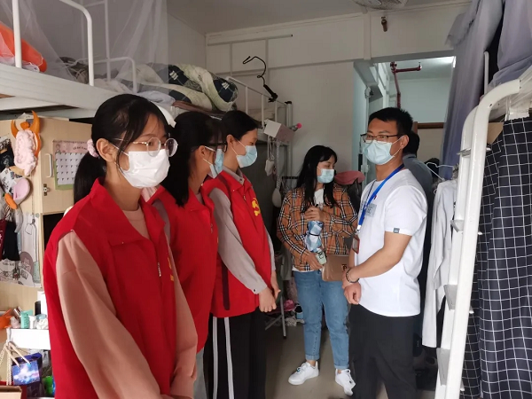 老师们在工作人员的陪同下,对我院学生宿舍进行实地检查走访。在走访过程中,老师们与同学们亲切交谈,了解到学生的生活情况以及可能存在的问题,提醒学生不要在宿舍使用大功率电器,避免安全隐患。并叮嘱学生要提高防疫安全知识,注意防火防盗,时刻保持良好的宿舍卫生。
